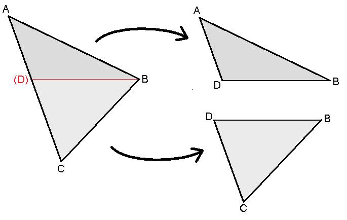 Once we've done this, we need to slice the triangle in half at Bj, so that we can deal with the two halves separately. This slice will produce a new vertex D along the edge between A and C, which has the same vertical position as B, but a different horizontal position (shown in red on the left side of the figure).